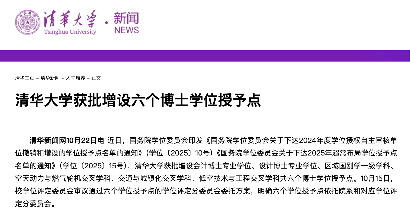 据清华大学新闻网消息,近日,国务院学位委员会印发《国务院学位委员会关于下达2024年度学位授权自主审核单位撤销和增设的学位授予点名单的通知》(学位〔2025〕10号)《国务院学位委员会关于下达2025年超常布局学位授予点名单的通知》(学位〔2025〕15号),清华大学获批增设会计博士专业学位、设计博士专业学位、区域国别学一级学科、空天动力与燃气轮机交叉学科、交通与城镇化交叉学科、低空技术与工程