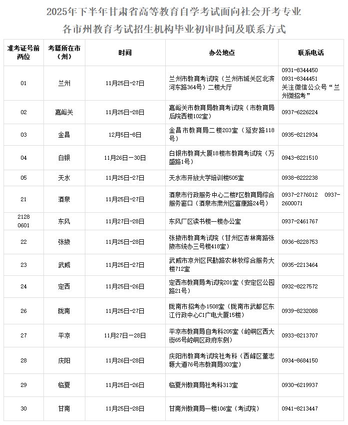 2025年下半年甘肃自考面向社会开考专业毕业初审公告