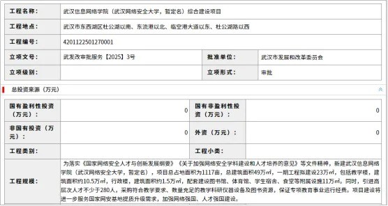 2025年2月,武汉公共资源交易平台发布武汉信息网络学院(武汉网络安全大学,暂定名)综合建设项目招标公告登记。