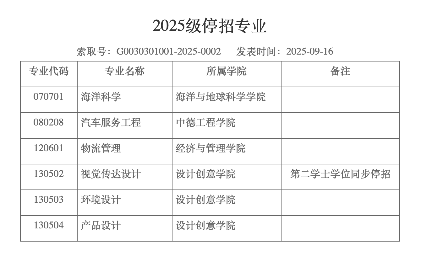海洋科学、汽车服务工程、物流管理、视觉传达设计(第二学士学位同步停招)、环境设计、产品设计