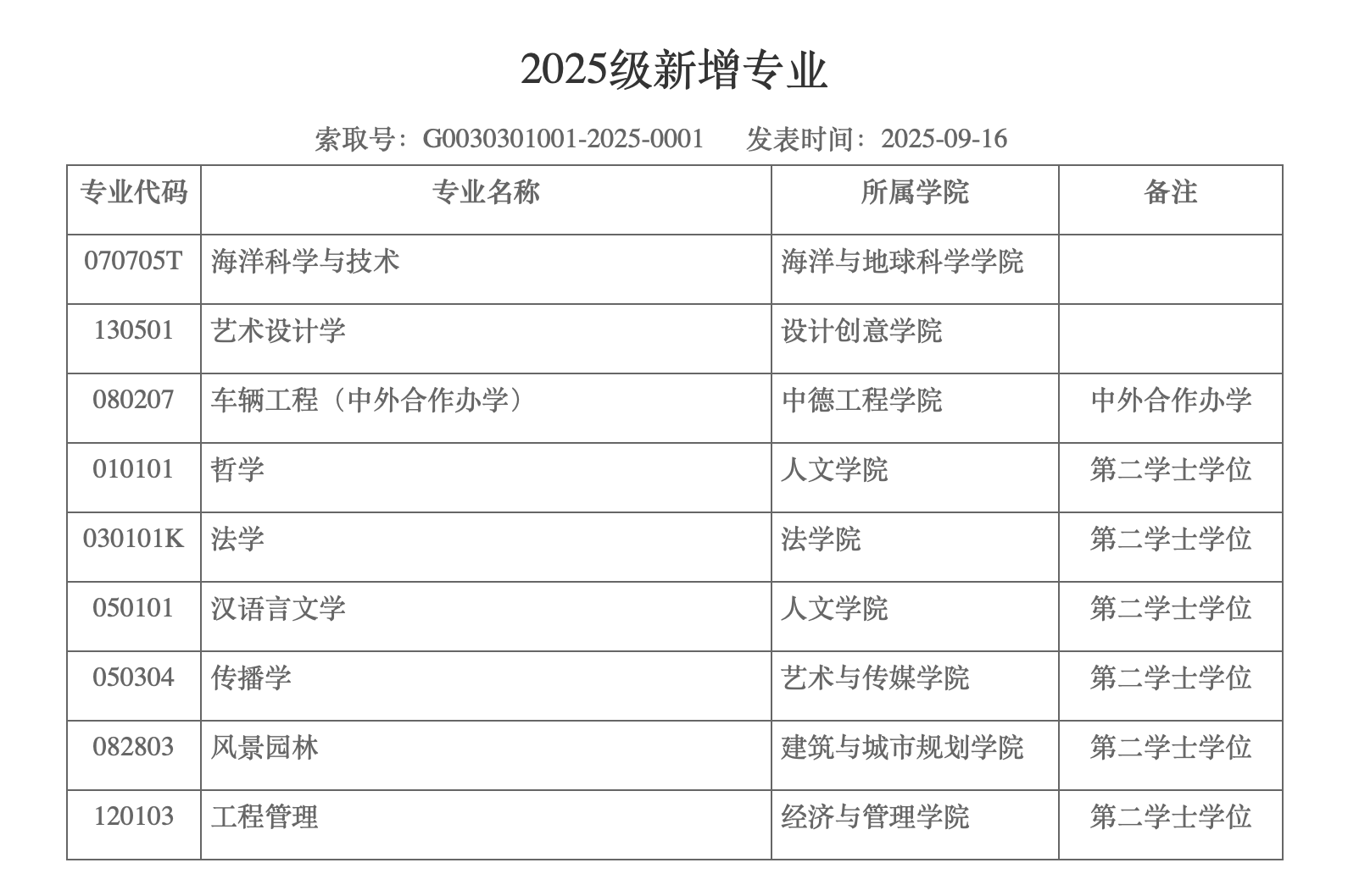 学校2025级新增专业为:海洋科学与技术、艺术设计学、车辆工程(中外合作办学)、哲学(第二学士学位)、法学