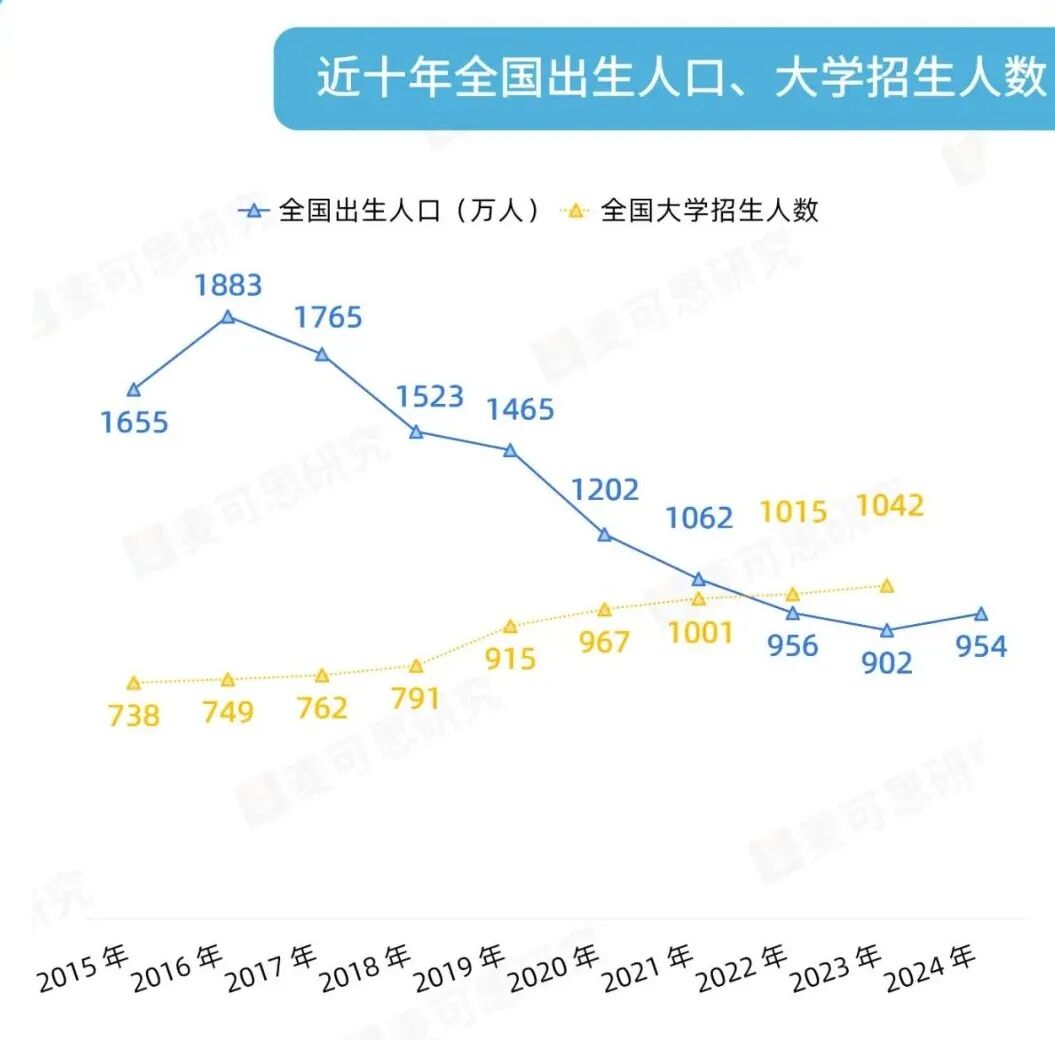需要注意的是,多省2024年高考招生人数已经超过了本省的出生人口数量,例如山东2024年高考共录取81.9万人,较该省出生人口数量多17万人。湖南省同样,2024年高考招生58.4万人,多于出生人口(38.6万)19.8万人。从全国范围近十年公布的人口数据来看,2024年我国出生人口较峰值(2016年:1883万人)减少929万人,新生人口减少将近一半。与此同时,高校招生数目前仍在逐年增长,2022年的大学生招生数已经超过当年的出生人口数。