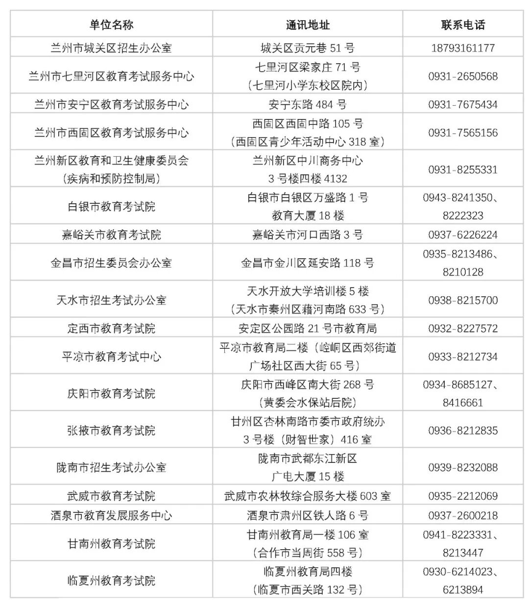 各市(州)教育考试招生机构咨询电话一览表