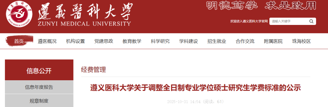 10月31日,遵义医科大学发布《关于调整全日制专业学位硕士研究生学费标准的公示》,根据省教育厅2025年3月下发的《省教育厅关于进一步完善我省全日制专业学位硕士研究生学科分类学费标准及有关事宜的通知》有关精神,学校经研究决定,拟在不超过文件规定的学科分类学费标准内调整现有全日制专业学位硕士研究生有关专业学费标准。