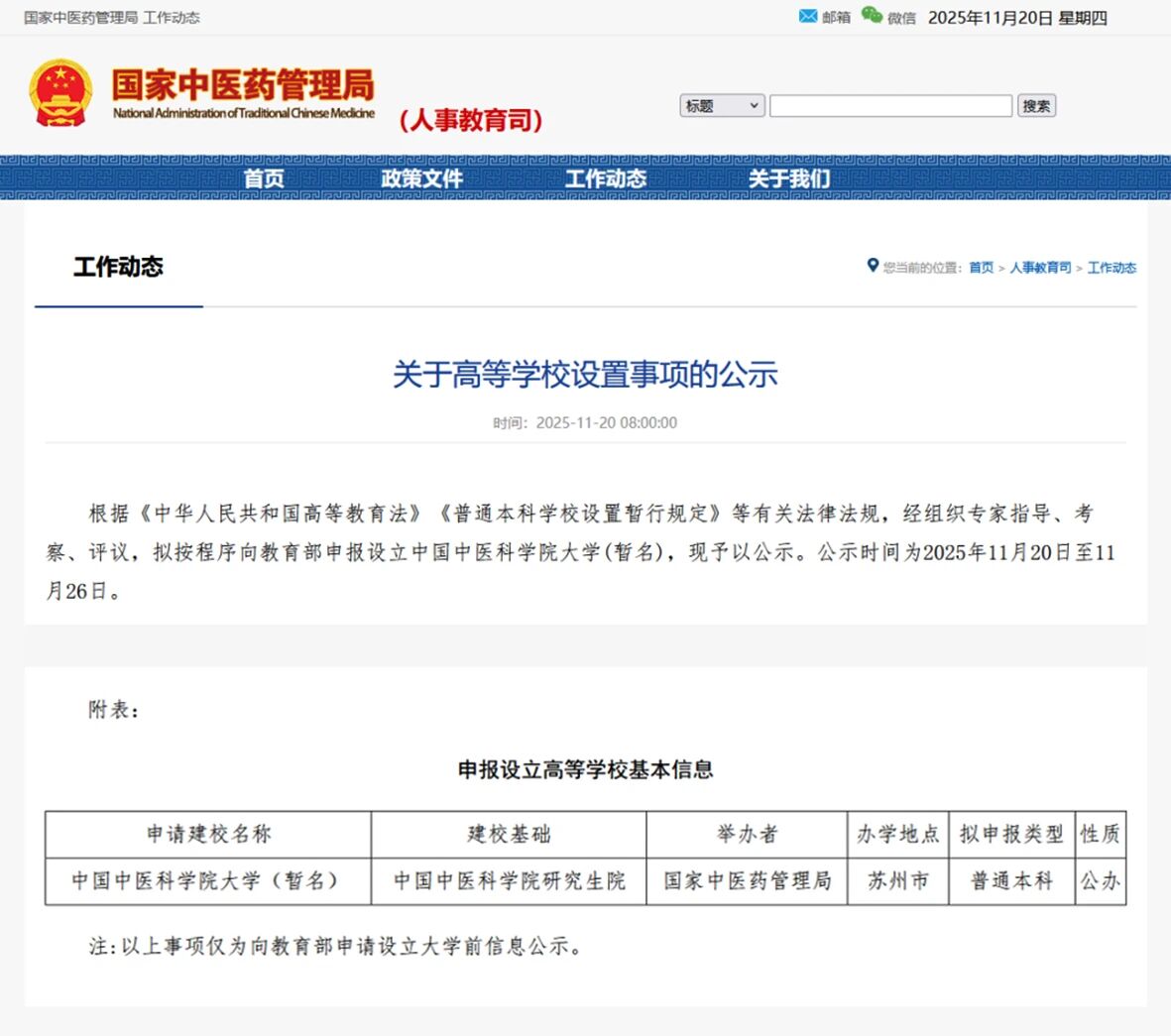 11月20日,国家中医药管理局发布《关于高等学校设置事项的公示》,指出拟向教育部申报设立中国中医科学院大学(暂名)。