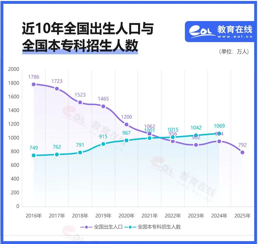 新生儿从2016年的1786万快速下降至2025年的792万,8年跌去56%。2024年全国高校招生1069万,如果加上专升本,中职直升高职的人数,则超过了1200万。包括大学在内,未来教育资源必然显著过剩,直白讲,就是没有生源了。这还是在二孩三孩政策