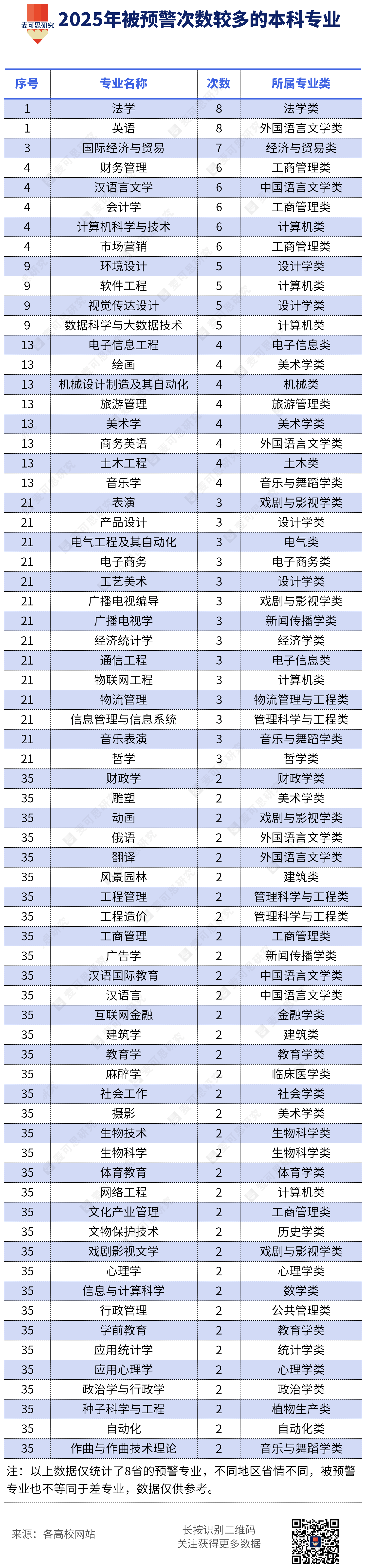 麦可思研究注意到,近三年山东、湖南、河北、广西、福建、贵州等多个省份,或在专业预警名单中,或在公开发布本省高校毕业生就业质量报告中,明确列出本省就业率排名较低、就业状况较差的专业,共涉及179个本科专业。(注:部分省份称为限制增设专业,为行文方便统一称为预警专业)